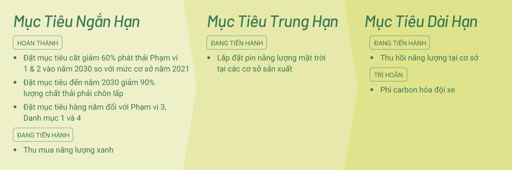 Lộ trình của chúng tôi nhằm đạt mục tiêu cắt giảm 60% phát thải vẫn đang đi đúng hướng thể hiện qua các mục tiêu ngắn hạn, trung hạn và dài hạn. Trong ngắn hạn, ưu tiên hàng đầu của chúng tôi là chiến lược thu mua năng lượng xanh. Về trung hạn, chúng tôi tập trung vào việc phát triển năng lượng mặt trời tại chỗ, một dự án đã bắt đầu được triển khai tại các cơ sở của chúng tôi ở Trung Quốc. Đối với các mục tiêu dài hạn, chúng tôi lên kế hoạch mở rộng sản xuất năng lượng tái tạo tại chỗ và áp dụng các biện pháp thu hồi năng lượng.